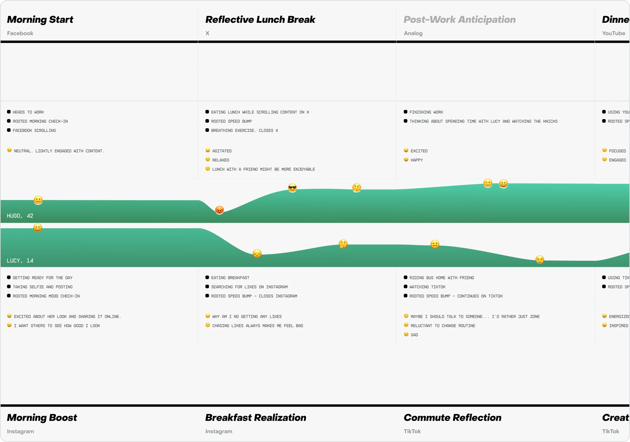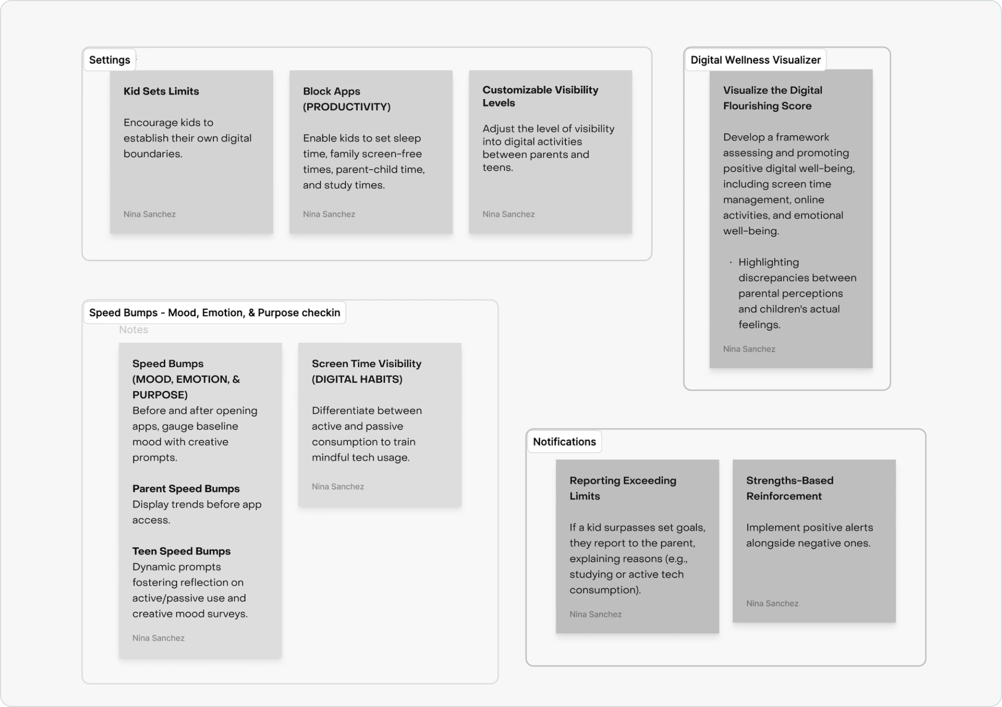 To ground the work in real family dynamics, we created two personas—a parent and a teen—and designed parallel user journeys. From this, we focused on four core features:
