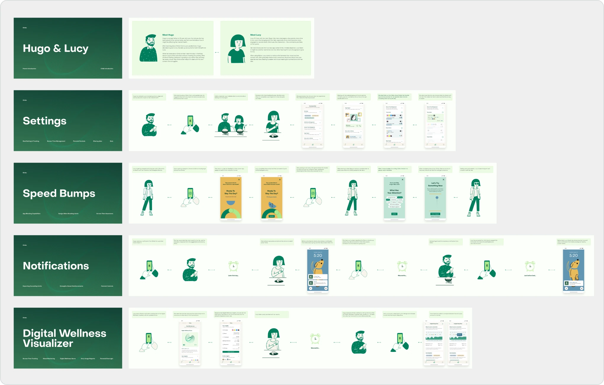 Designing parallel journeys allowed us to understand not only individual experiences, but how the app mediated communication between parents and kids—central to Ginko’s philosophy.